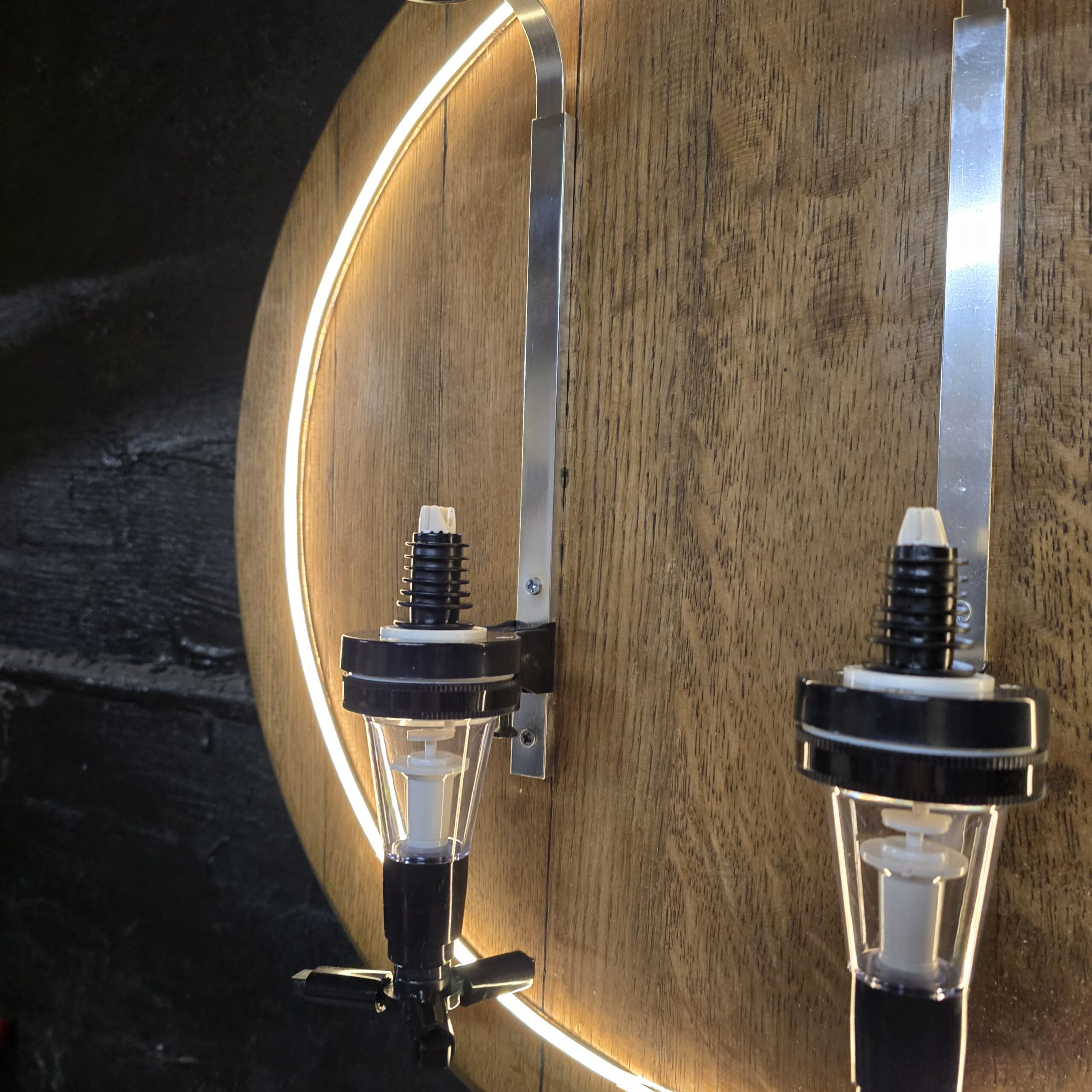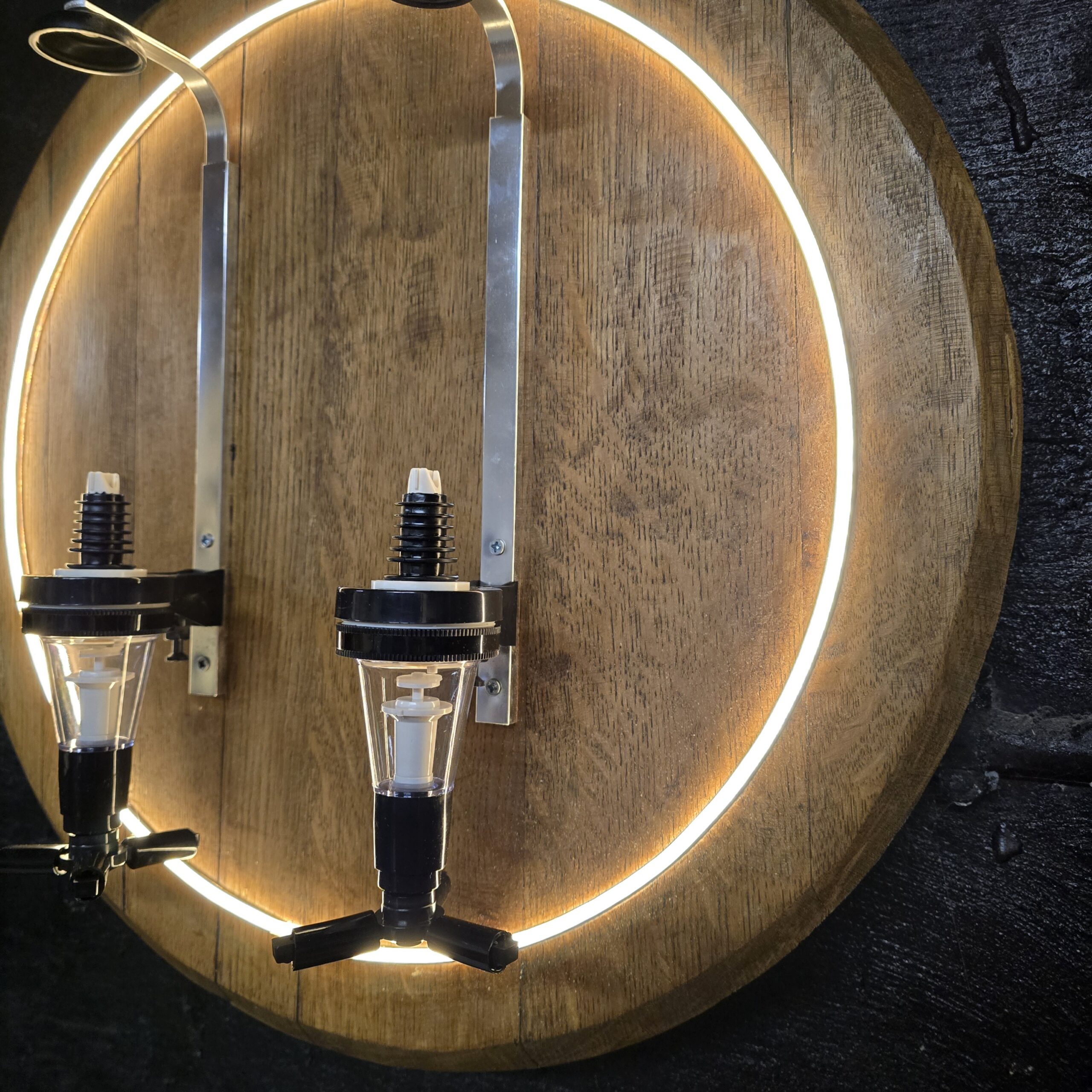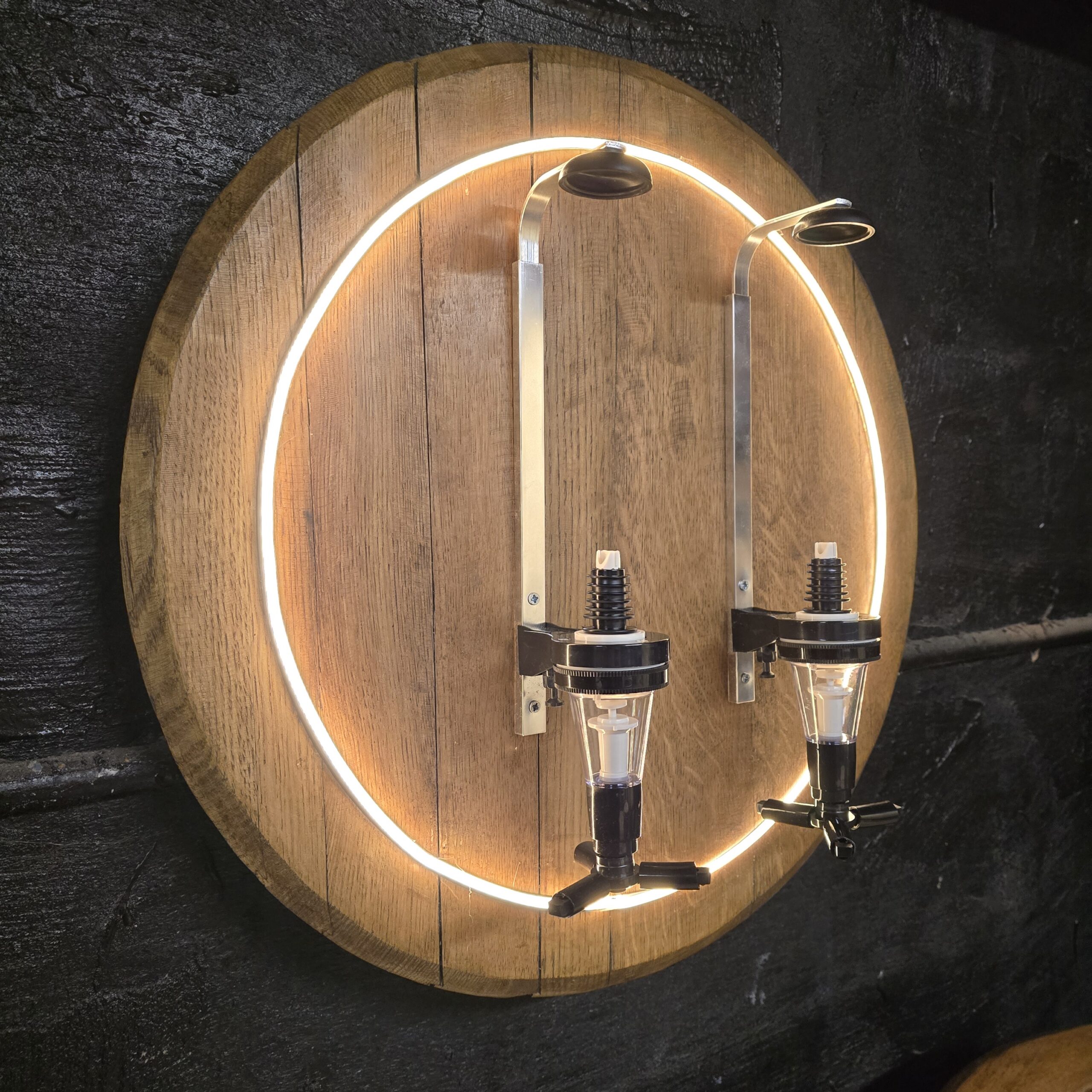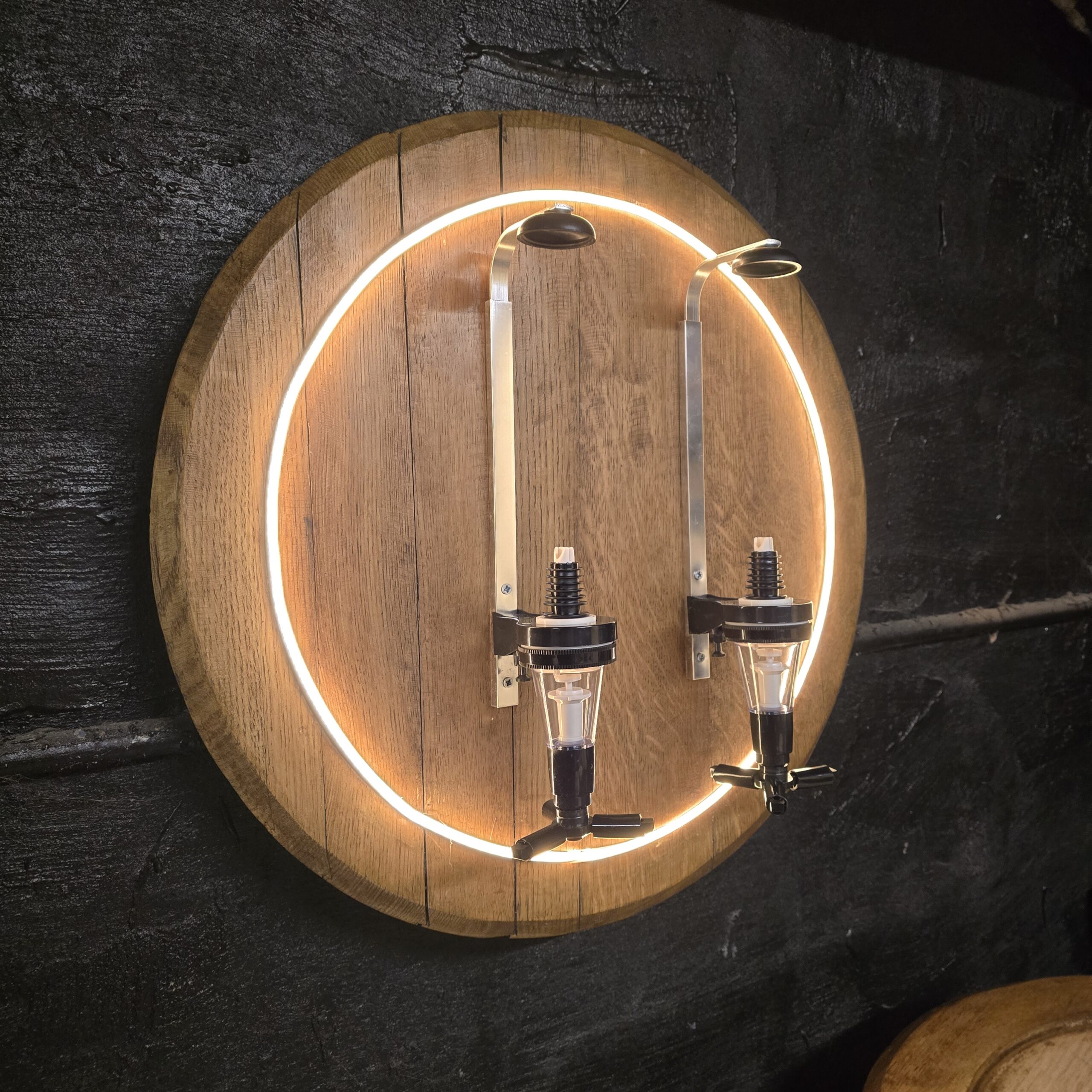 Bring authentic distillery craftsmanship into your home with this Reclaimed Oak Barrel Lid Spirit Display, handcrafted from genuine whisky barrel lids measuring approximately 54cm in diameter.