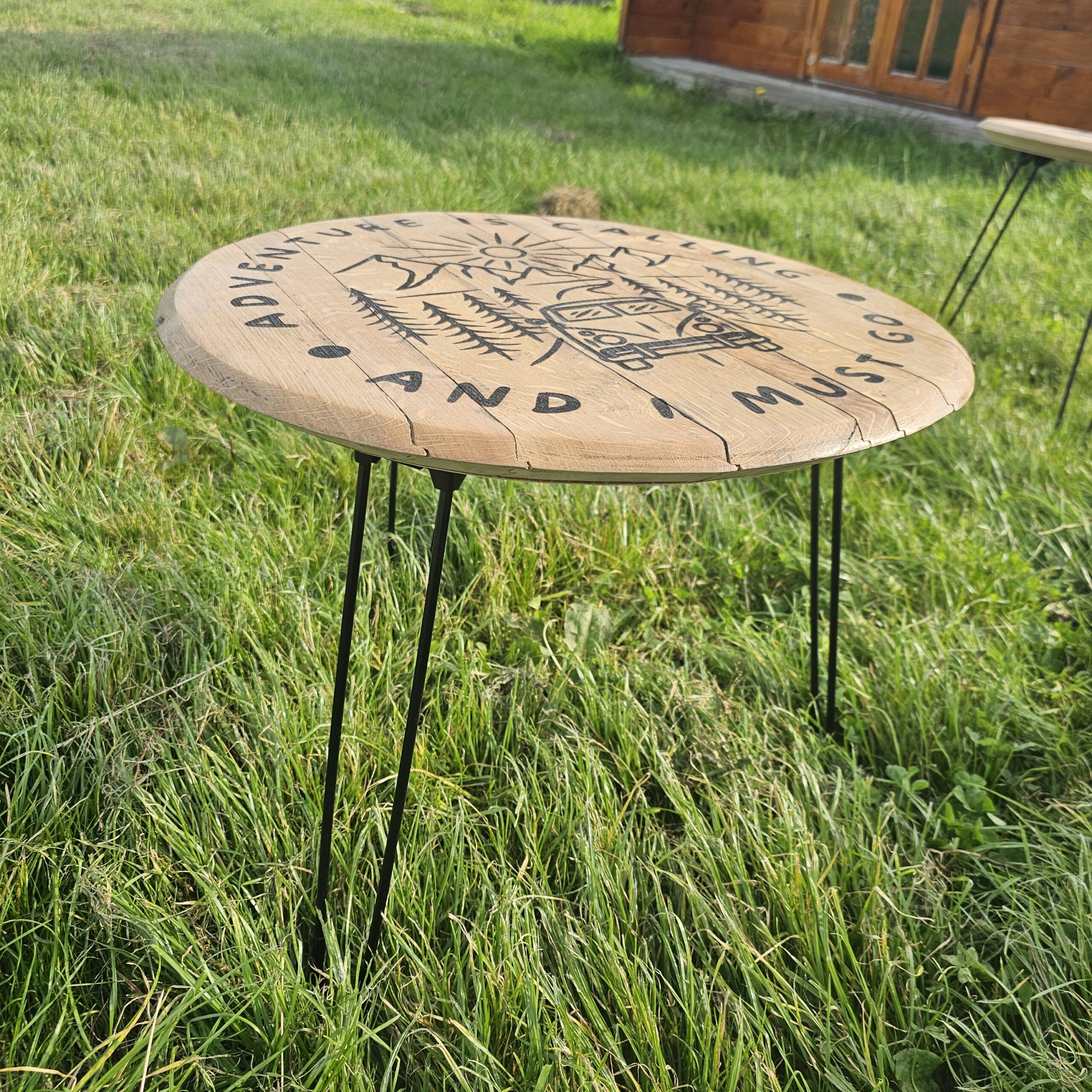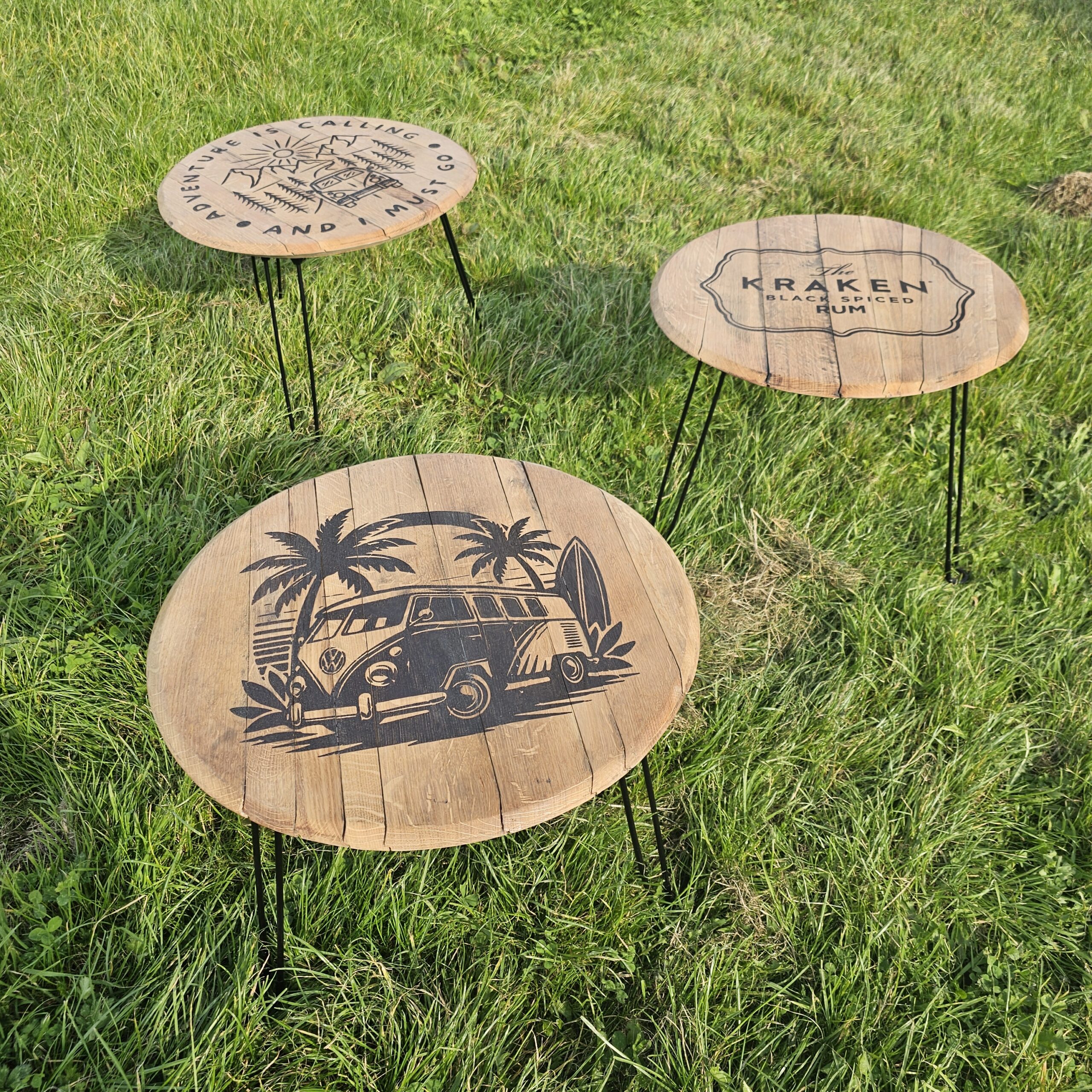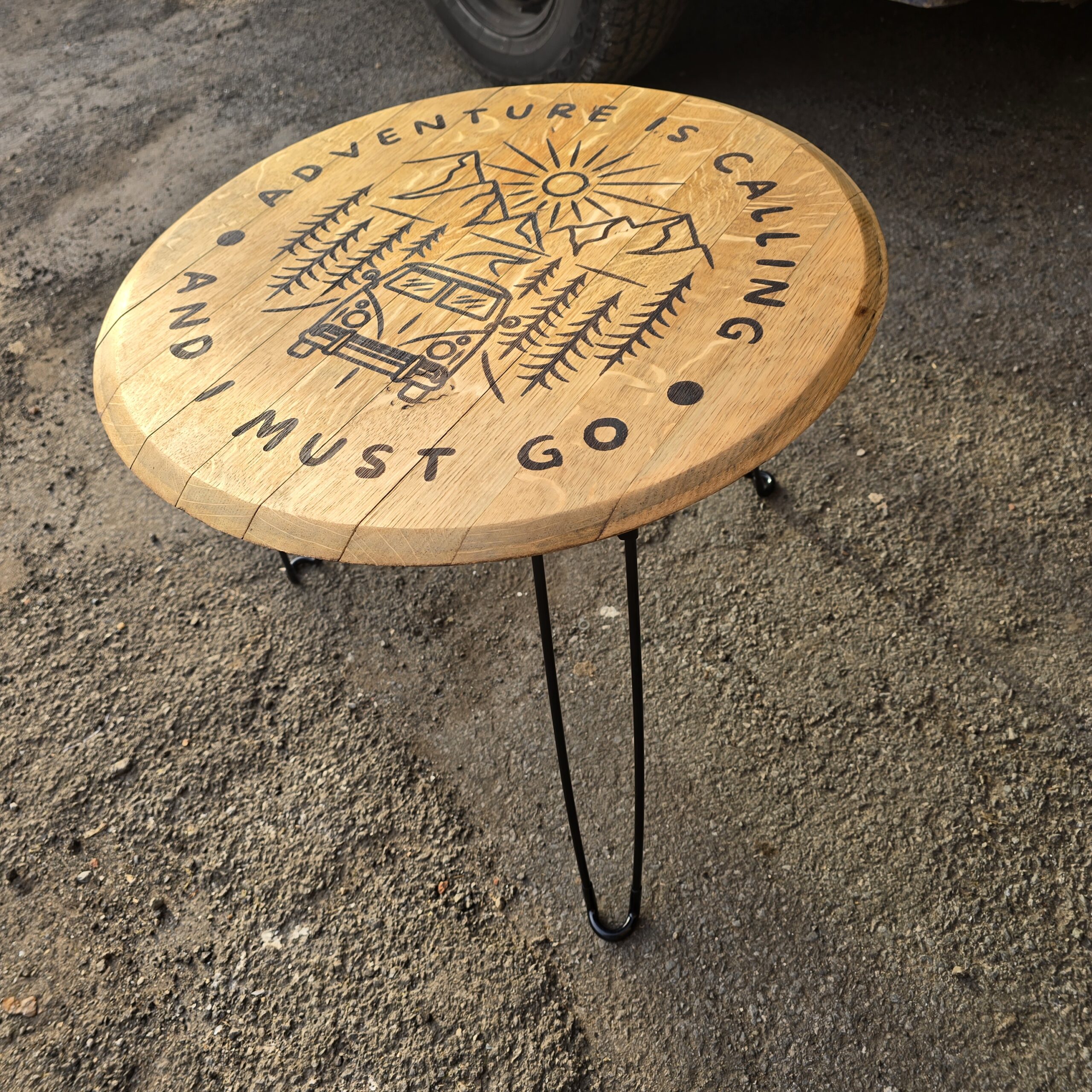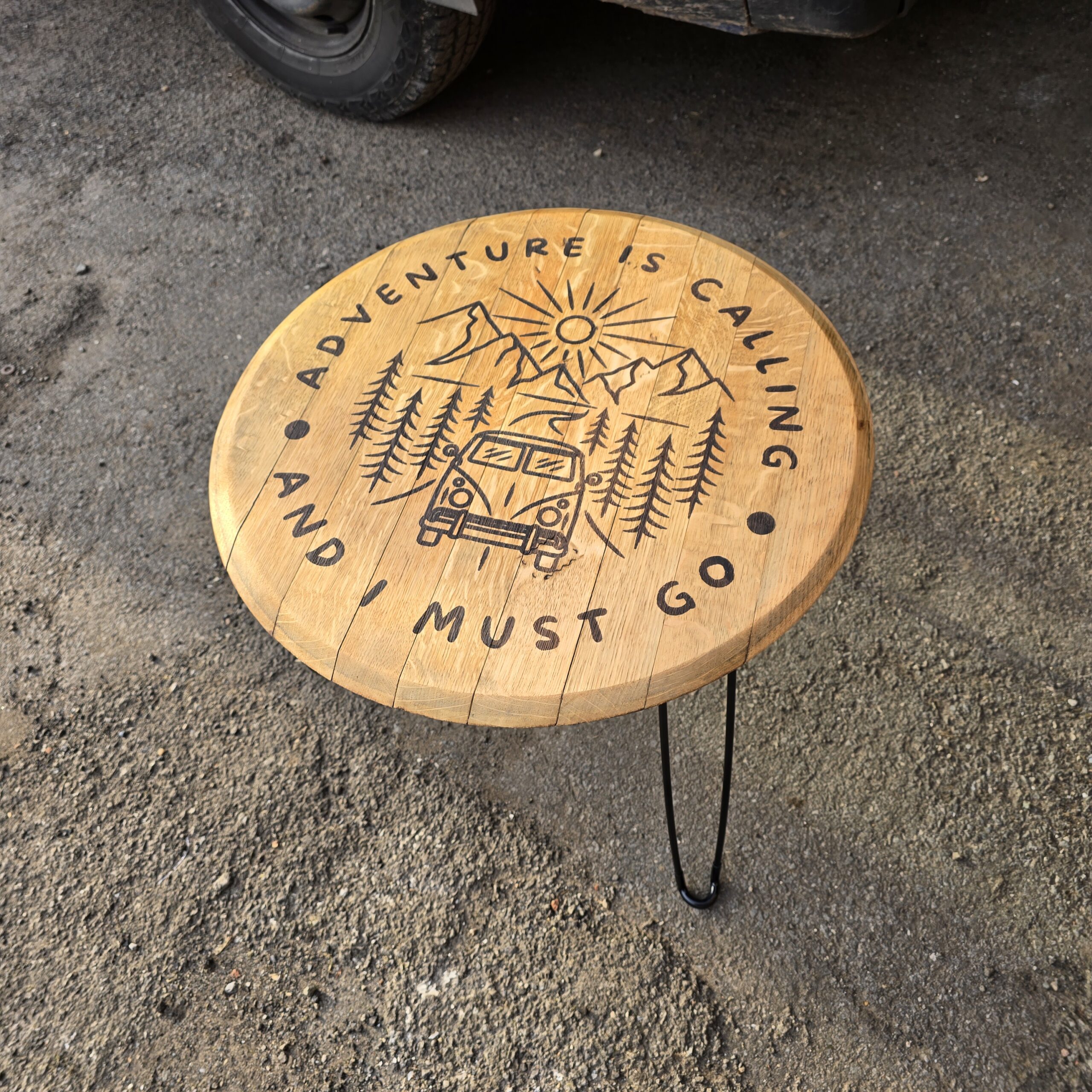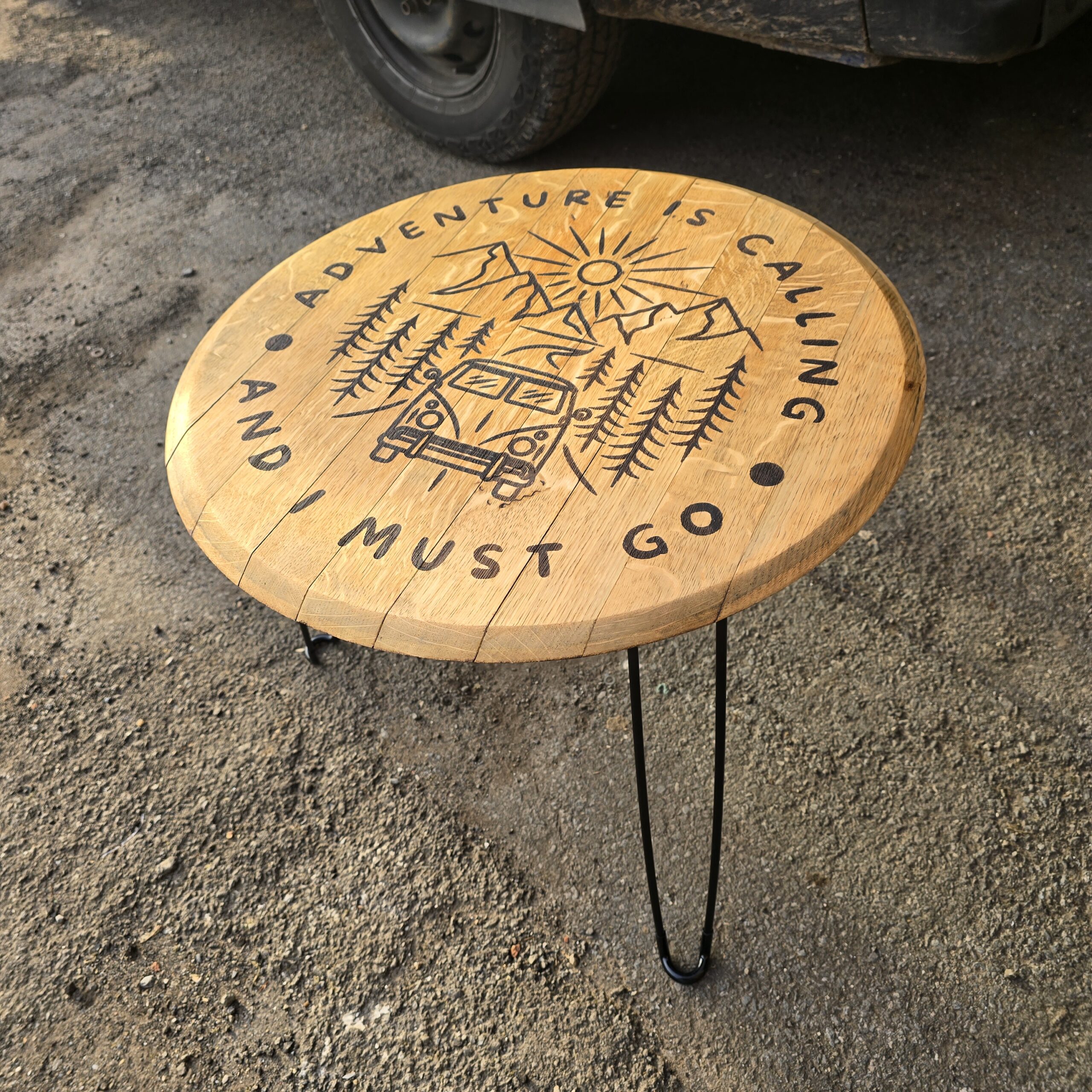 Each lid is carefully selected and features a precision laser-engraved camper van design, adding a distinctive, rustic charm that makes every table truly one of a kind.