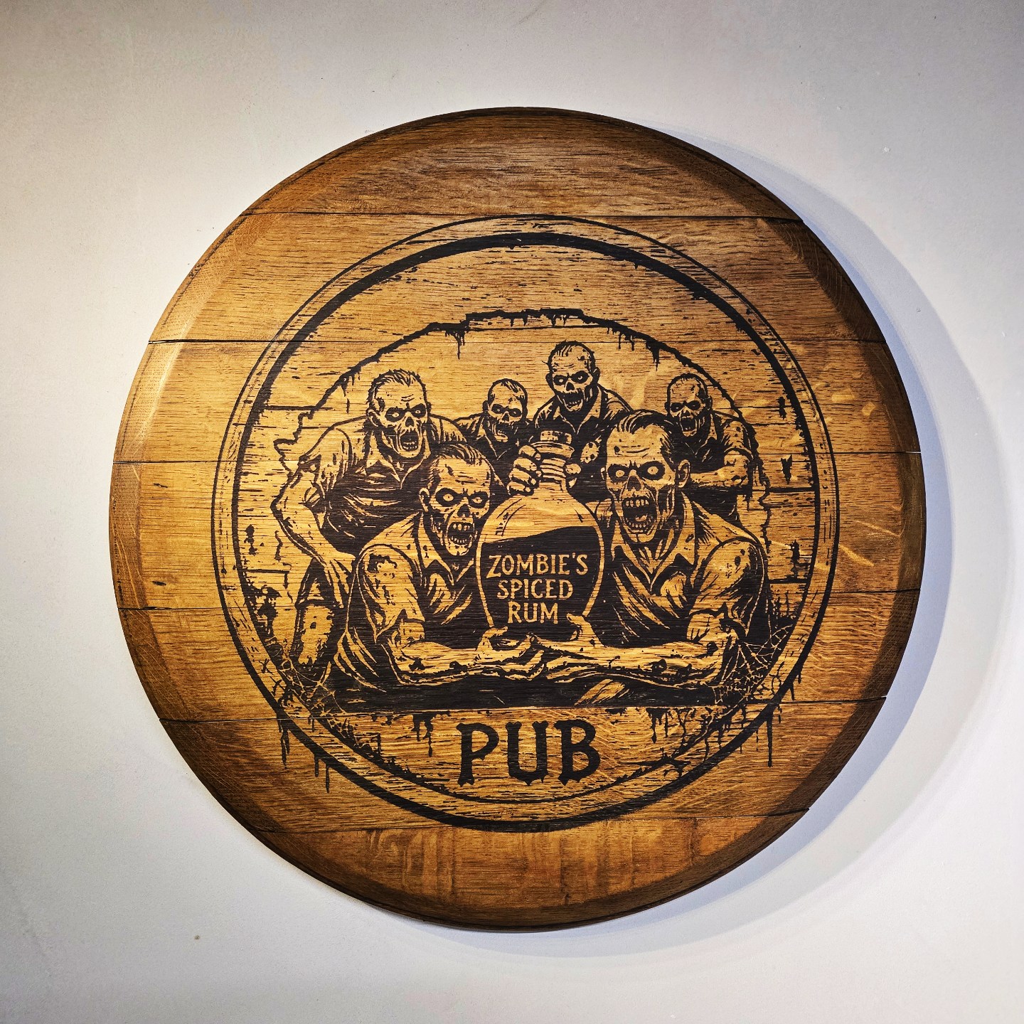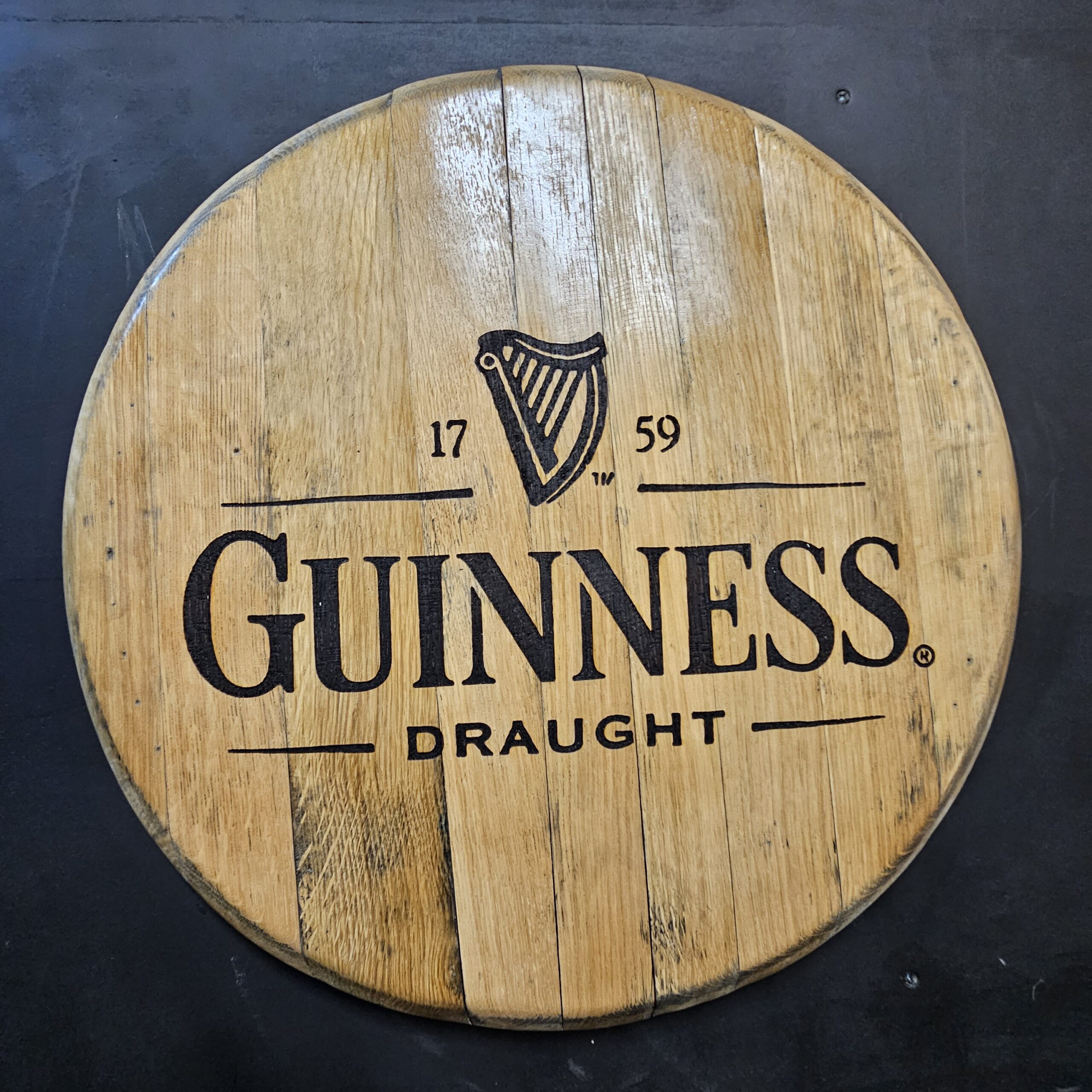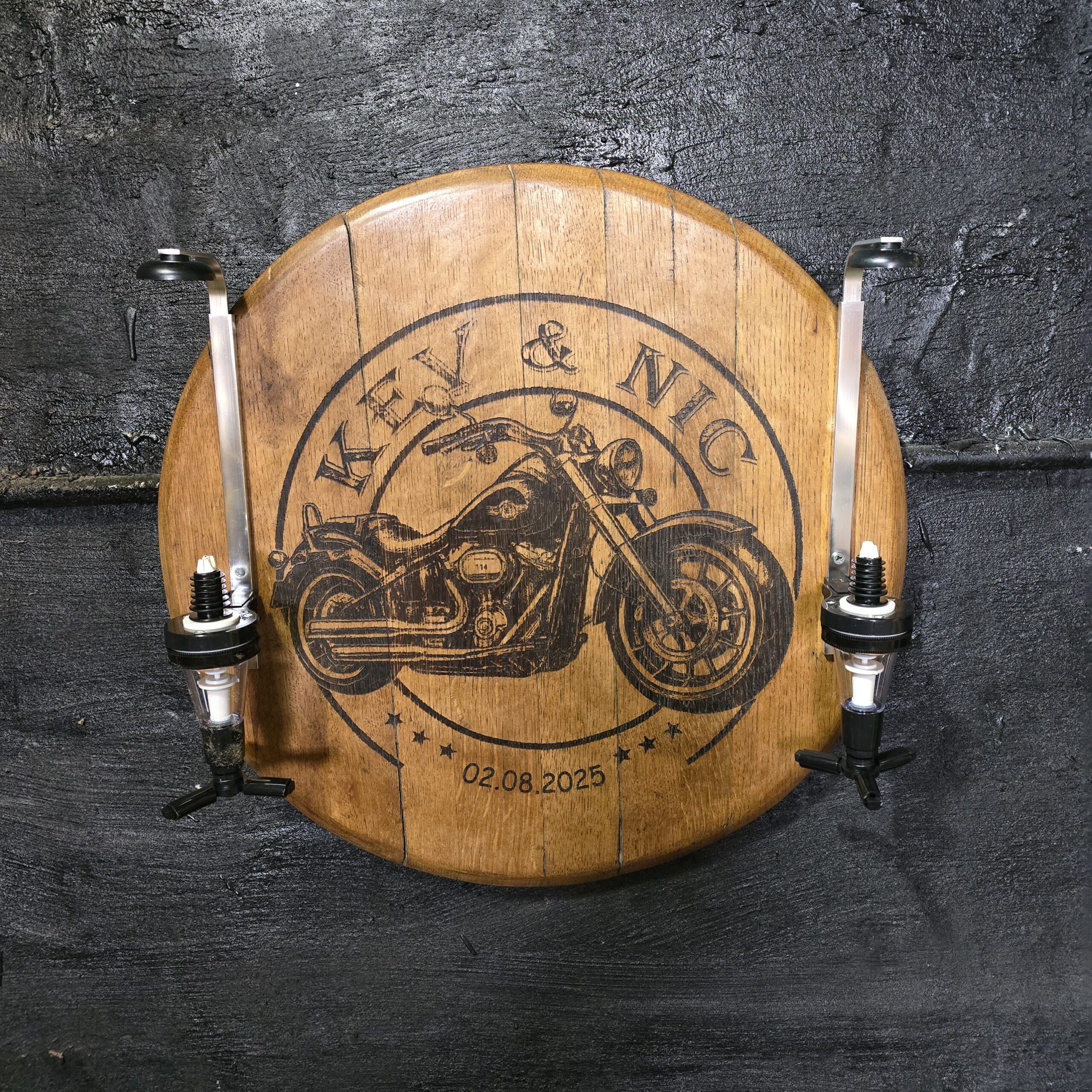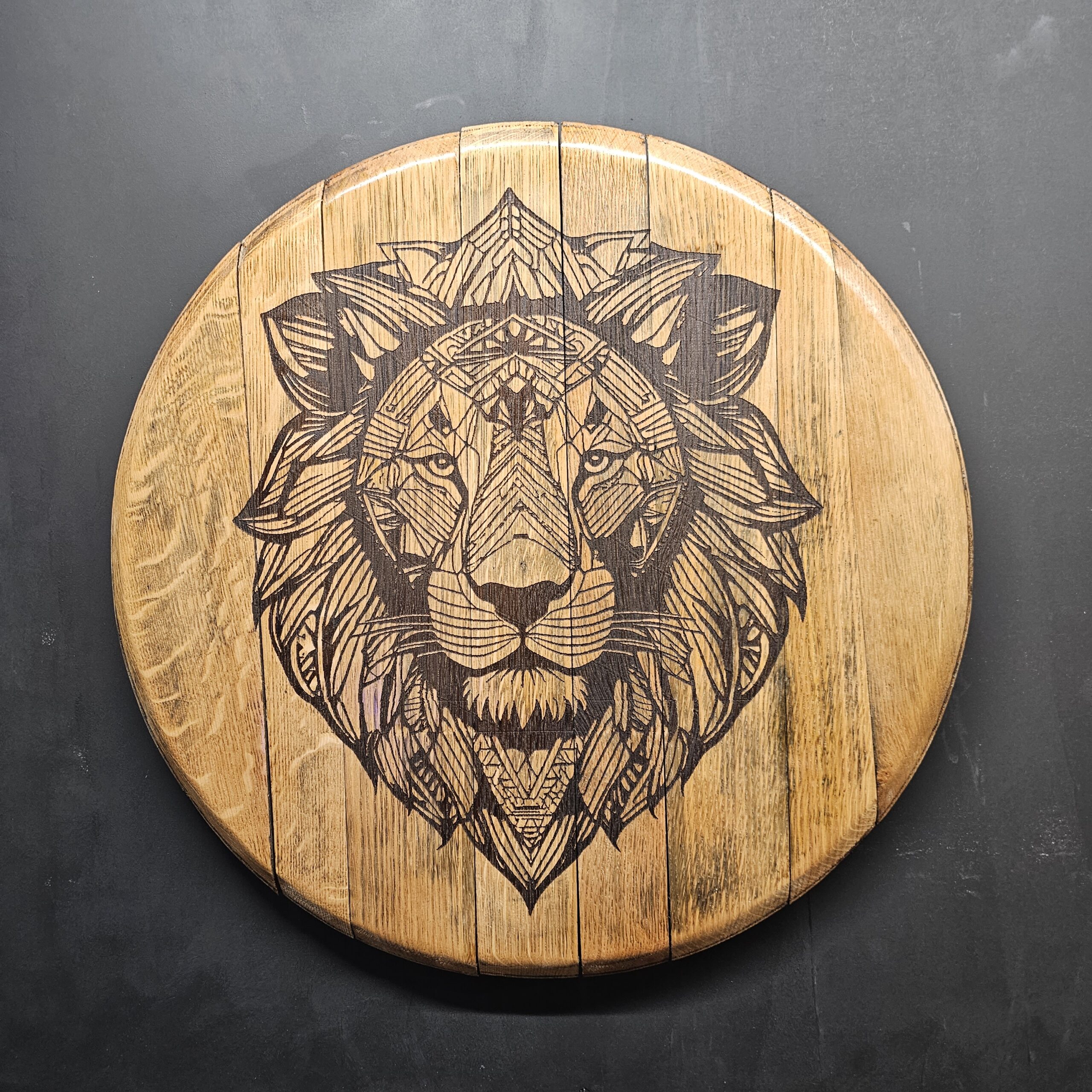 Create a truly one-of-a-kind statement piece with this reclaimed oak barrel lid, custom laser engraved with your own logo or design. Measuring approximately 54cm in diameter, each lid is carefully selected and transformed into a functional and decorative wall-mounted display.