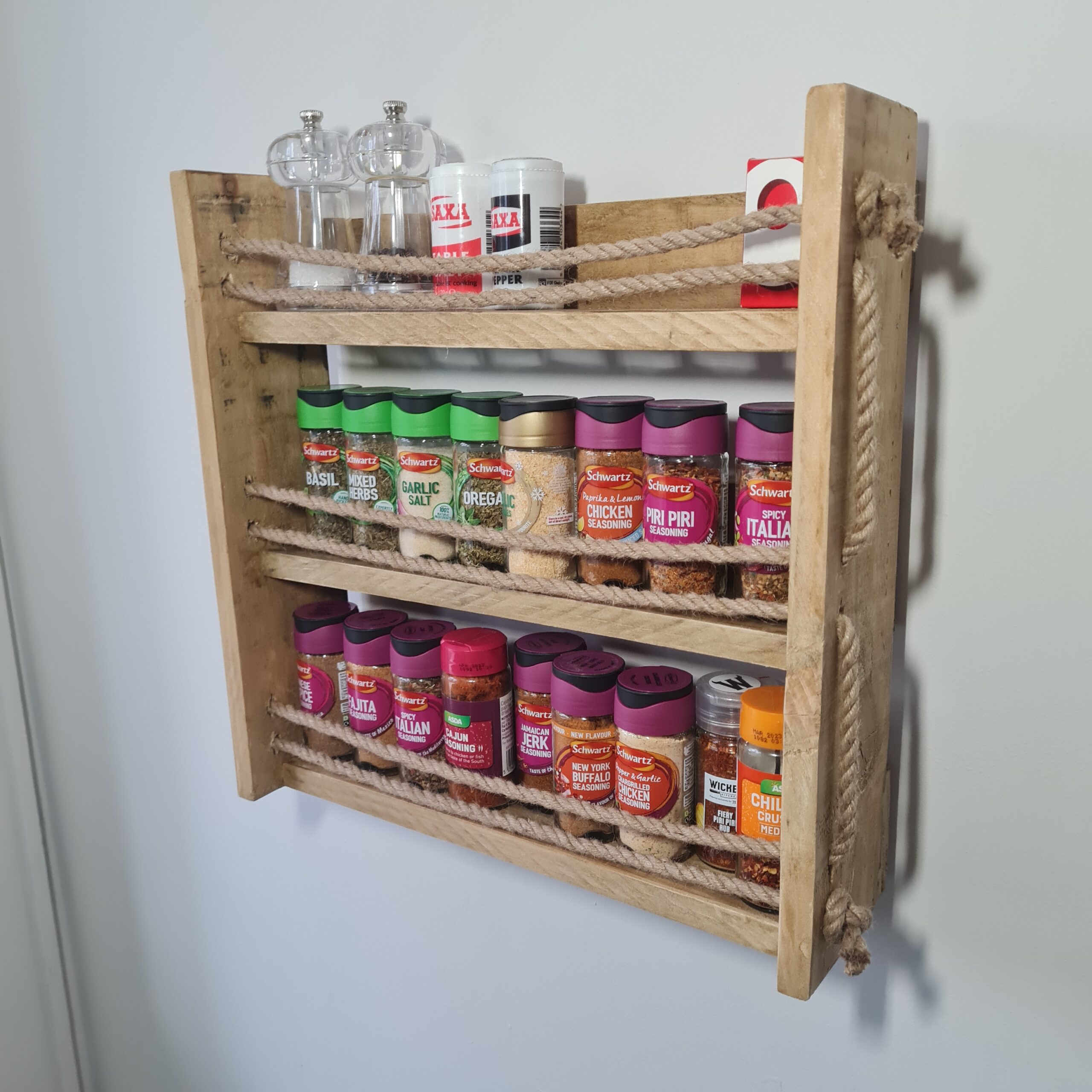 Add charm and practicality to your kitchen with our handcrafted wall-mounted spice rack, made from reclaimed pine and finished with 100% natural hessian rope. Combining rustic materials with thoughtful design, this piece brings both character and functionality to your space.